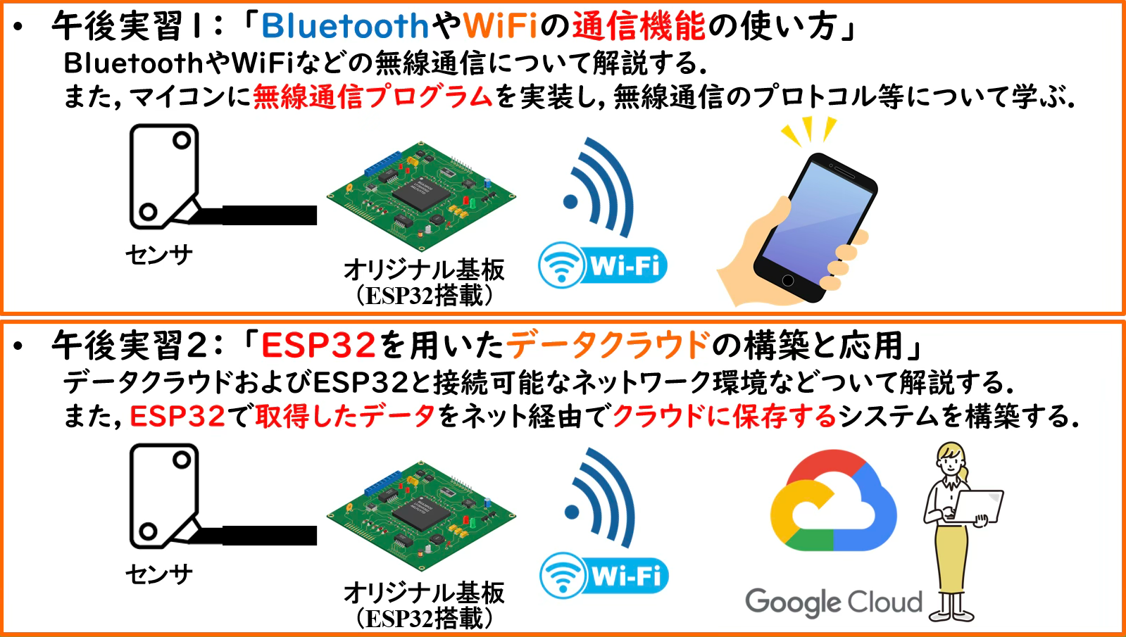 | プログラム:以下の内容でマイコン「ESP32」を用いて実習を行います. | ||||||||||||||||